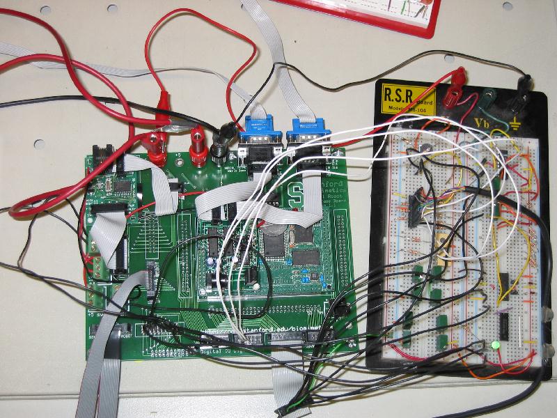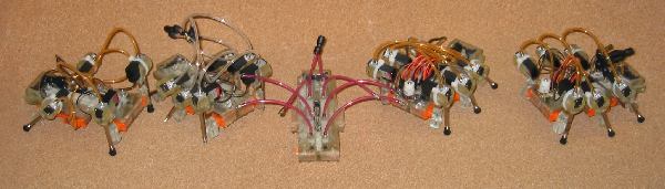| The Sprawlette Interface Board (SIB) is used to connect the TERN board to a PC (not-necessary, but useful for display), the actual Sprawlette body, a servo motor controller, and 2 H-bridge ICs. The SIB also provides convenient access to all the IO capabilities of the TERN, which are used when features are added to the Sprawlette body. |