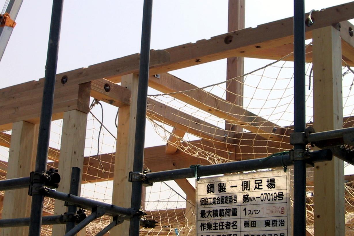What I learned later from Prof. Ken Sasaki at U. Tokyo is that the addition of steel brackets is a post-Kobe-earthquake requirement. The traditional construction, with no plywood sheathing and few diagonal braces, has been found to give adequate stiffness only if exceptionally close tolerances are achieved in the mortise and tenon.